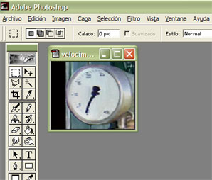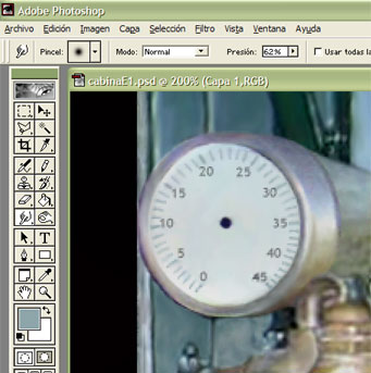 Una vez estamos satisfechos con el aspecto que presenta la cabina, podemos empezar a implementar los controles e indicadores más sencillos, como el del Velocímetro. Para lograr un aspecto más real, sustituiremos la aguja, que presenta una forma característica. Antes de eliminarla en la imagen de fondo, guardaremos un archivo que la contenga (no es necesario guardar la imagen entera de la cabina, sólo la de ésa parte) para trabajar la definitiva a partir de élla: