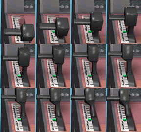 A base de copiar la capa, desplazar las copias y distorsionarlas progresivamente, tenemos una imagen con todas las posiciones de la palanca, como muestra la lista de capas de Photoshop. Sólo tenemos que mostrar una palanca, acoplar la imagen y trasladarla con la herramienta Mover a un nuevo archivo gráfico. Cuando hayamos colocado todos los frames, tendremos casi listo el archivo de la textura final (que por supuesto, hay que convertir a *.ace, y además suele necesitar su correspondiente canal alpha de transparencias)