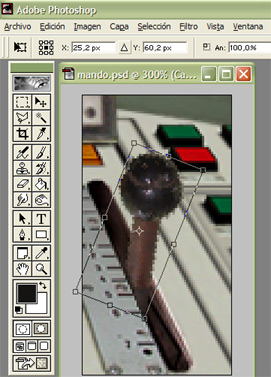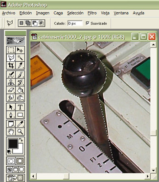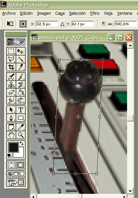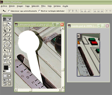 3. Seleccionamos, con la herramienta Lazo Poligonal, el contorno de la palanca. Cuando esté seleccionada, cambiamos a la herramienta Mover y arrastramos la selección directamente sobre nuestro archivo que contiene el fondo del mando: