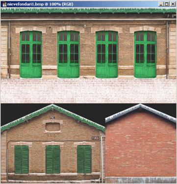Podemos seguir pintando zonas donde se acumula la nieve, reservando la parte de las fachadas que queda protegida por los aleros del techo, en fin, siguiendo siempre un criterio lógico para representar la nieve donde se acumularía en la realidad. Al final, la hoja de textura nos ha quedado así: